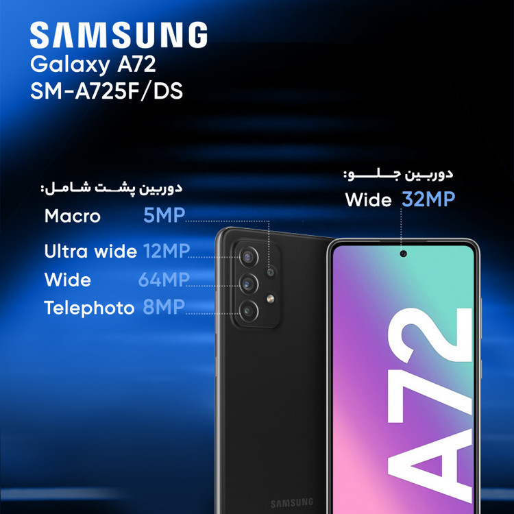 گوشی Samsung Galaxy A72 از یک مجموعه دوربین چهارگانه برخوردارست . در پنل پشتی آن لنزهای 64 مگاپیکسلی (عریض)، 8 مگاپیکسلی (تله فوتو)، 12 مگاپیکسل (فوق عریض)، 5 مگاپیکسل (ماکرو) به چشم میخورد. لنز اصلی 64 مگاپیکسلی گوشی گلکسی a72 از نوع واید یا عریض است. و از قابلیت فوکوس خودکار با تشخیص فاز برخوردارست. سایز پیکسلی آن نیز 0.8 میکرومتر و اندازه دهانه دیافراگم f/1.8 است. لنز تلهفوتو 8مگاپیکسلی 73 میلیمتری در کنار لنز اصلی قرار دارد. و مجهز به لرزشگیر اپتیکال تصویر، بزرگنمایی اپتیکال 3 برابری تصویر و قابلیت فوکوس خودکار با تشخیص فاز است. لنز 12 مگاپیکسلی از نوع اولتراواید و یا فوق عریض با زاویه دید 123 درجه و دهانه دیافراگم f/2.2 است. لنز 5 مگاپیکسلی ماکرو گوشی a72 نیز قادر به عکسبرداری از سوژههای بسیار کوچک و از نزدیک است.